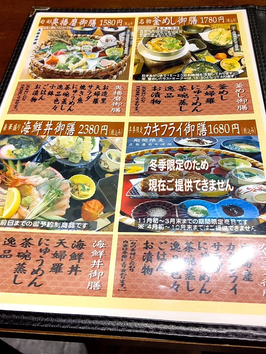 奥播磨御膳 includes fresh sashimi, tempura, and a flavorful にゅうめん that tantalizes your taste buds.
